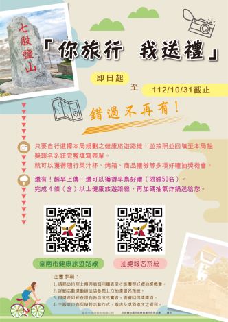 1、於活動時間內自行選擇衛生局規劃之健康旅遊路線至少1條。 (健康旅遊路線網址:https://p.tainan.gov.tw//NMebb4)