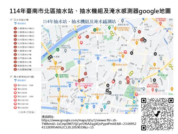 114年臺南市北區抽水站、抽水機組及淹水感測器google地圖(114年2月版)